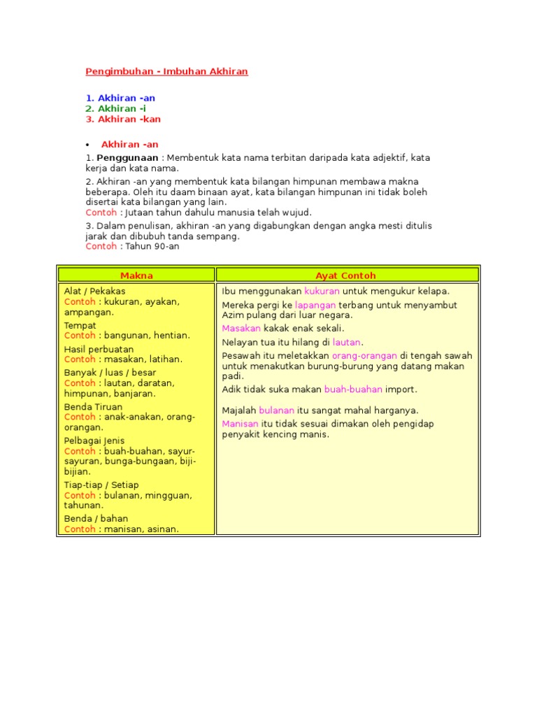 Ejaan Yang Disempurnakan EYD ini menggantikan Ejaan Soewandi atau Ejaan Republik. Imbuhan akhiran -an menerbitkan kata nama yang memberi maksud tertentu kepada perkataan dasar yang diimbuhkannya dengan membawa erti-erti berikut. Kata nama ialah perkataan yang boleh menjadi unsur inti bagi binaan frasa namaSelalunya perkataan demikian menamakan orang haiwan tempat benda atau konsep.